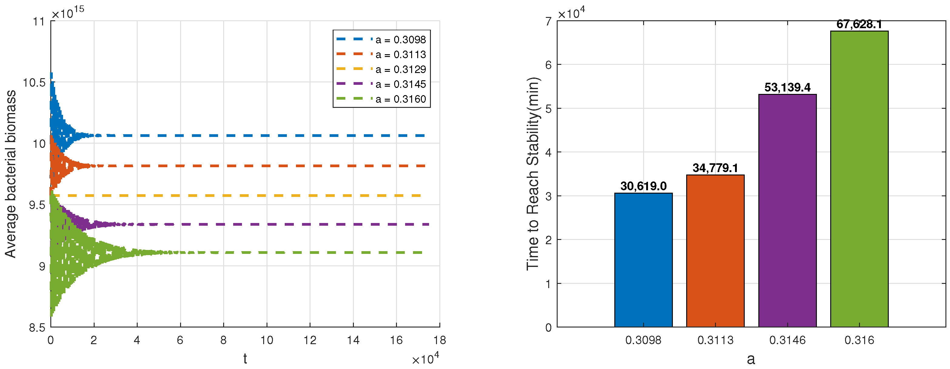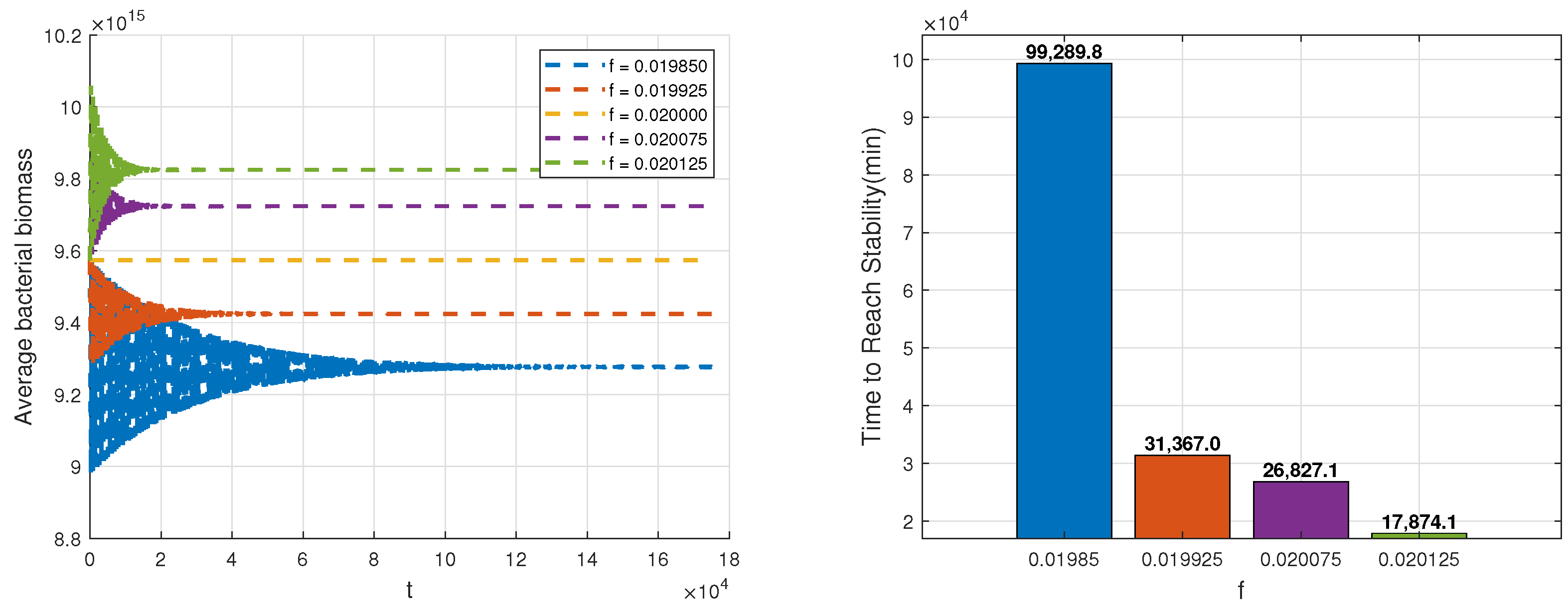, the average bacterial biomass is relatively low, but the system takes 67,628.1 min, approximately 4.7 days, to reach stability.