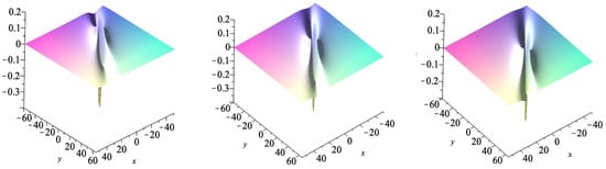 Another important class of explicit structures includes rogue waves and lump waves. Rogue waves are transient, large-amplitude localized structures that decay in all directions in both space and time. Lump waves, by contrast, are rationally localized, decaying algebraically in all spatial directions at fixed time []. For example, the KPI equation admits a variety of lump solutions, some of which arise as long-wave limits of multi-soliton configurations [,]. Lump-type solutions have also been observed in nonintegrable KP-, BKP-, and KP-Boussinesq-type systems (see, e.g., [,,,]) and even in linear higher-dimensional wave models through superposition principles.