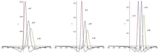 The Figure 1, Figure 2, Figure 3, Figure 4, Figure 5, Figure 6, Figure 7, Figure 8 and Figure 9 below provide 3D and 2D plots of the lump waves , , and , computed for the parameter sets specified as follows: