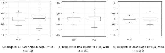 We further conducted 1000 simulations and plotted boxplots of the 1000 RMSE values for parameters and , as shown in Figure 1 and Figure 2. From the figures, we can observe the following: The RMSE values of and for both methods decrease as the sample size increases; however, the OQIF method already exhibits good performance with a small sample size (n = 100), while the PNLS method requires a larger sample size to achieve similar accuracy. The boxplots of the OQIF method are more symmetric and compact, indicating that the distribution of its estimators is closer to the normal distribution and has better statistical properties. Additionally, the OQIF method has significantly fewer outliers than the PNLS method, demonstrating stronger robustness against abnormal data. This suggests that the overall performance of the OQIF method in parameter estimation is superior to that of the PNLS method, with more pronounced advantages especially in cases of finite samples.