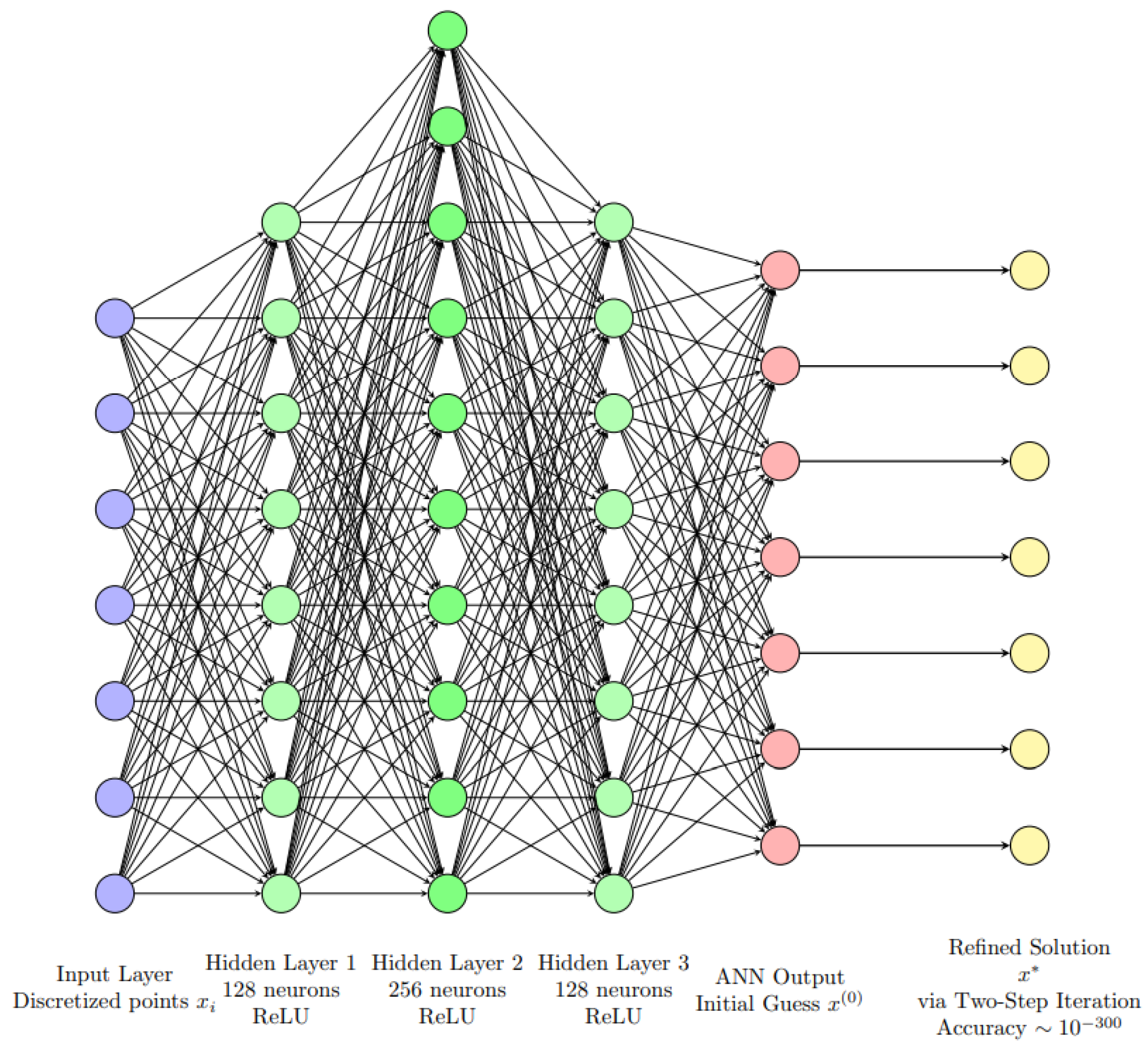 ANN-based framework for solving the discretized absolute boundary value problem. The input layer encodes the discretized grid points, and the ANN hidden layers (32–64–32 neurons with ReLU activations) produce an initial approximation . This estimate is subsequently refined by a two-step iterative nonlinear solver (e.g., implemented in MATLAB), yielding a final solution with accuracy up to .