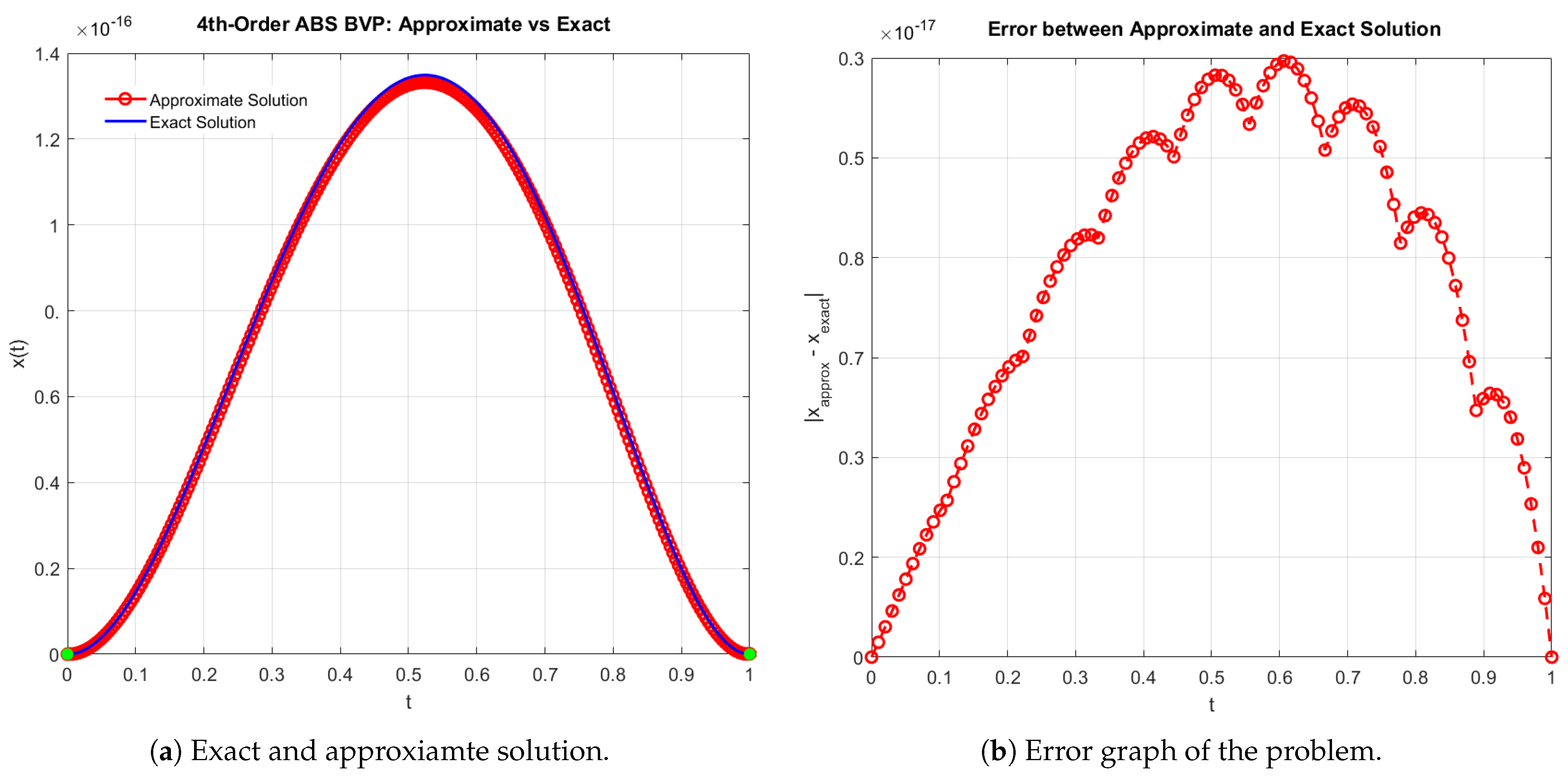 (a,b) Comparison of exact and approximate solutions for the ABVP in Example 4.