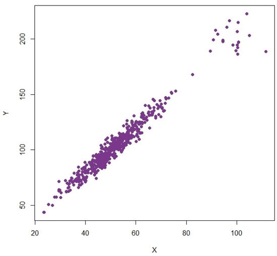 Such outliers are combined with the main data to create a population size of 500 units. This structure provides a controlled environment to evaluate the effect of high-leverage points on traditional and robust estimators.