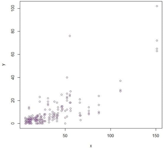 We examine a popular dataset of the frequency of epilepsy seizures as another empirical demonstration of the proposed estimators. The dataset is known as epil and it is publicly available via the MASS package in R. It documents the amount of epileptic seizures the patient experiences during a given monitoring period. In our analysis, Y is the outcome variable, which is the total number of seizures that have been observed in the follow-up period, whereas X is the auxiliary variable, which is the number of seizures that have been experienced before the treatment is administered. Further, , , and . The scatter plots for both real-world populations showing anomalies are provided in Figure 4 and Figure 5. MSE and PRE results are provided in Table 3, Table 4, Table 5 and Table 6.