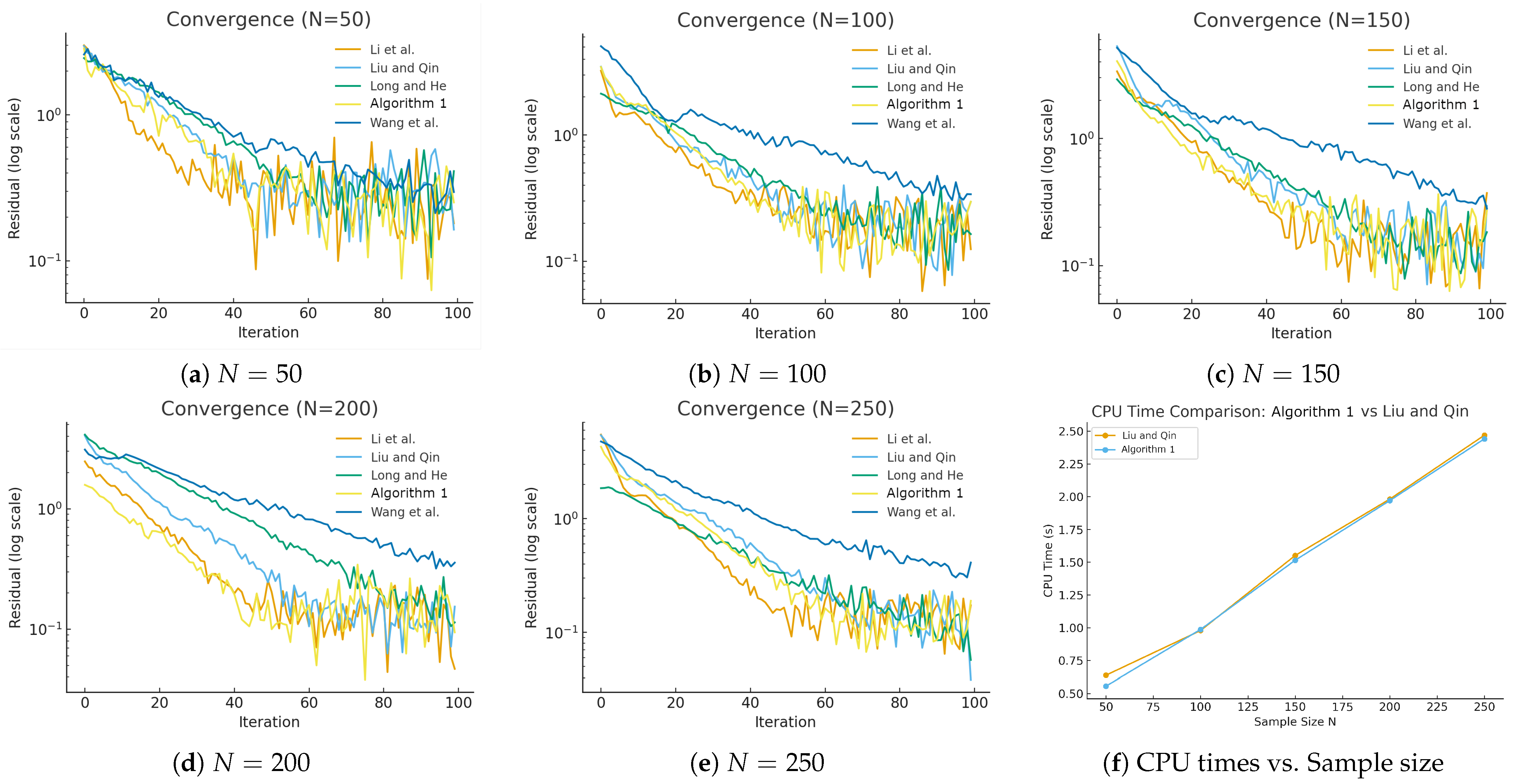 | Liu & Qin [31] | Two averaged maps; one projection to X + one to half-space | Discrete backtracking on ; adaptive | Inertial extrapolation with cap | A.s. convergence under monotone/quasi-monotone maps; inertia accelerates but is safeguarded |