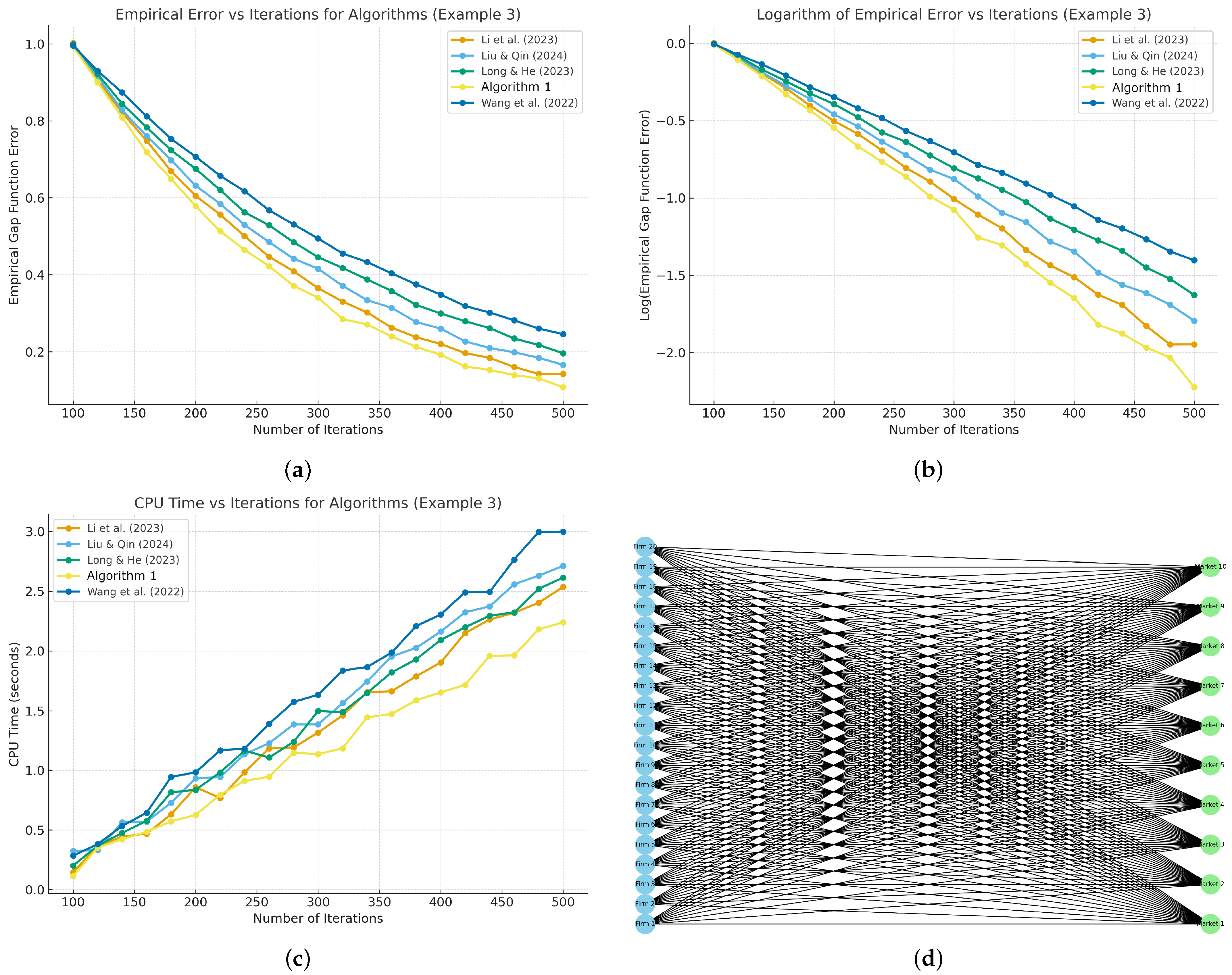 | Algorithm 1 | One projection to X + one to half-space ; two batch evaluations | Adaptive via norm ratio rule | Inertial with adaptive cap | A.s. convergence under quasi-monotone F; good balance of stability and speed |
