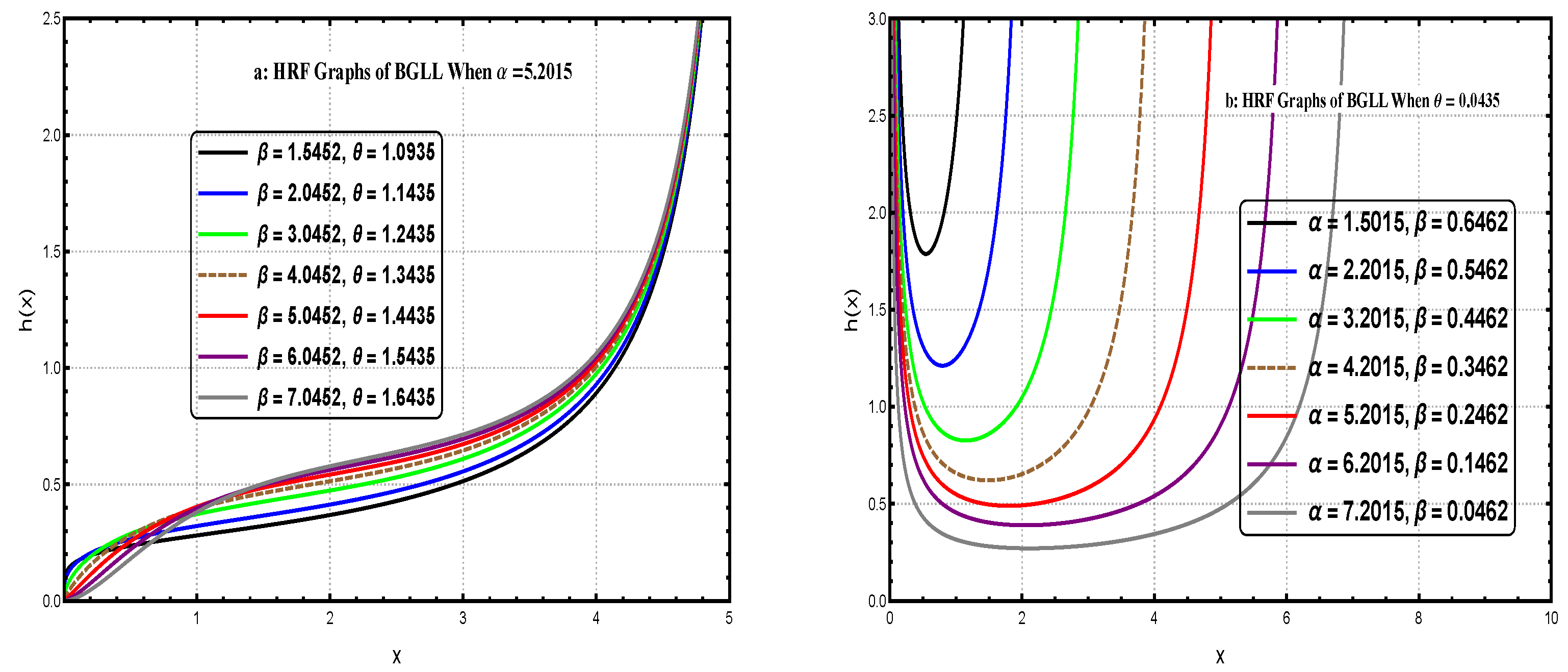 - For and : HRF is initially increasing (IFR property) and may have a maximum point (unimodal).