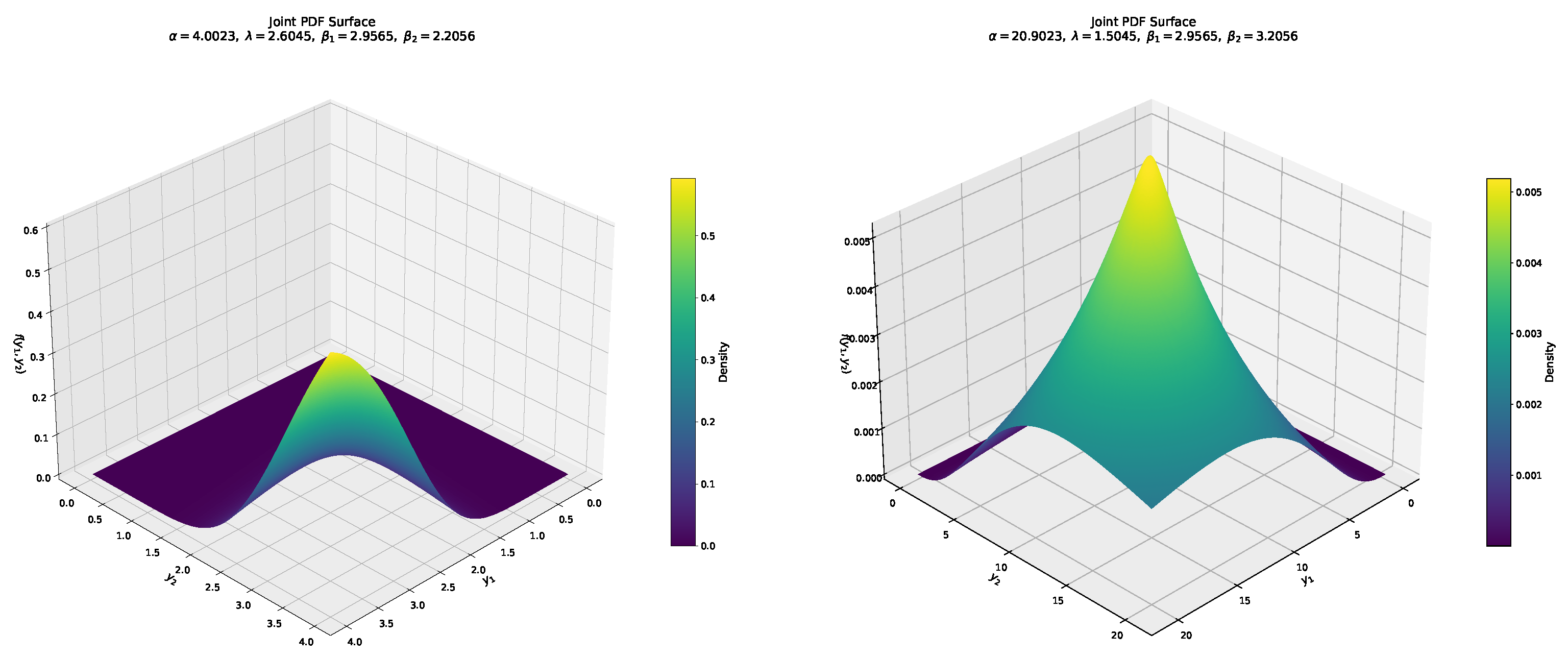 - Generalized dependence structures: Although this paper used a shared exponential kernel through , extensions to alternative dependence mechanisms (e.g., Farlie–Gumbel–Morgenstern or Archimedean-type kernels) could adapt the model to different correlation profiles.