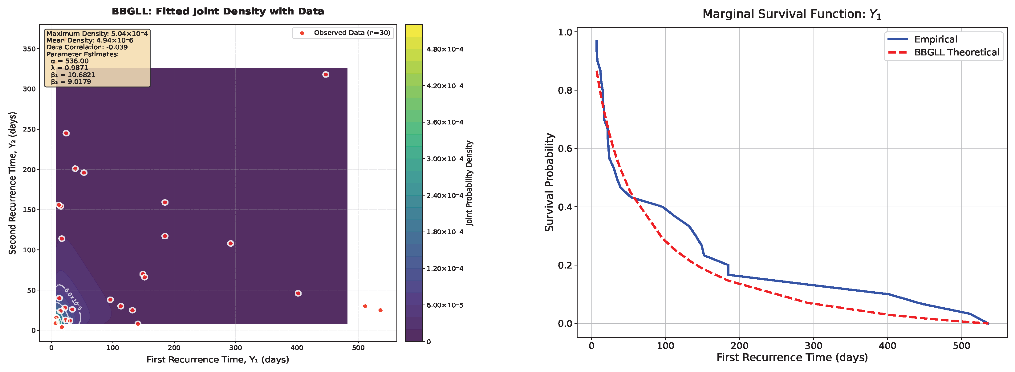 - Asymmetric marginal shapes: the Gompertz–log-logistic mixture captures early acceleration and late deceleration of failure intensity.