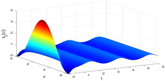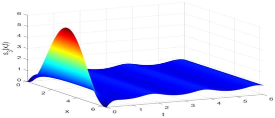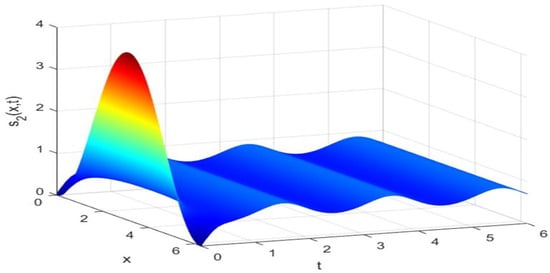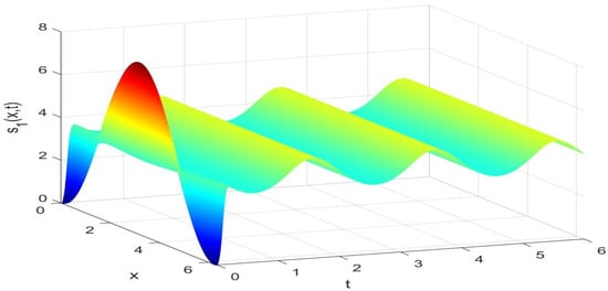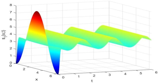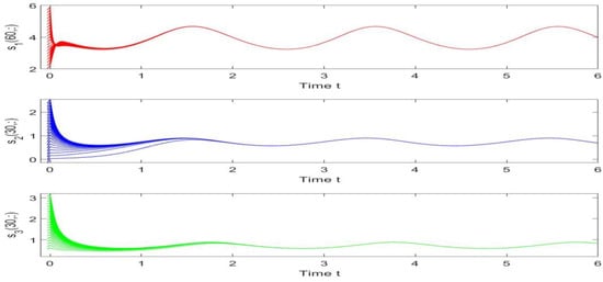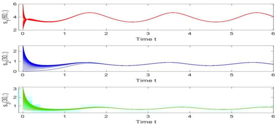 Utilizing the finite difference method [40] and the MATLAB 7.0 software package, we can derive numerical solutions for model (44) subject to the boundary and initial conditions outlined in (45). These solutions are illustrated in Figure 1, Figure 2 and Figure 3. From Figure 1, Figure 2 and Figure 3, it is evident that models (44) and (45) possess a strictly positive, spatially homogeneous, 2-periodic solution. Specifically, in the context of models (44) and (45), the densities of prey and predators exhibit periodic oscillations with a period of 2 and distribute uniformly in space as time progresses sufficiently. In order to verify that the periodic solution of model (44) and (45) is globally asymptotically stable, we selected different initial values and conducted extensive numerical simulations. The results showed that for any positive initial value, the 2-periodic solution of model (44) and (45) is asymptotically stable. Please refer to Figure 4 for details. In order to verify the existence of a globally asymptotically stable periodic solution for models (44) and (45) with different time delays, we conducted numerical simulations for different time delays and found that models (44) and (45) still possess a strictly positive, spatially homogeneous, 2-periodic solution. Figure 5, Figure 6, Figure 7 and Figure 8 show the results when time delays .