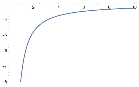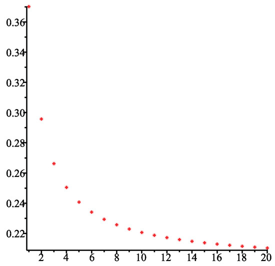 The value of when is shown in Figure 5. We see that decreases with an increasing . For large , the limiting probability is approximately equal to 0.21.