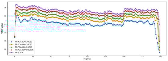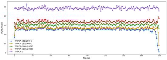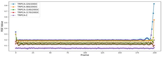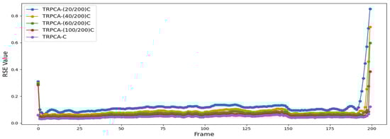 Similarly, Figure 4 shows the relative squared error (RSE) values for TRPCA algorithms (TRPCA-(20/200)C, TRPCA-(40/200)C, TRPCA-(60/200)C, and TRPCA-(100/200)C), and the classical TRPCA algorithm (TRPCA-C) across various frames. Upon examining this figure, we notice that for most frames, the RSE values are relatively close across different algorithms, further supporting the notion of consistent recovery quality. Once again, in some specific frames, TRPCA-(20/200)C and TRPCA-(40/200)C display slightly lower RSE values than TRPAC-C and TRPCA-(100/200)C, reinforcing the trend observed in the PSNR analysis.