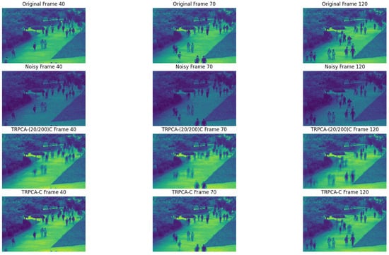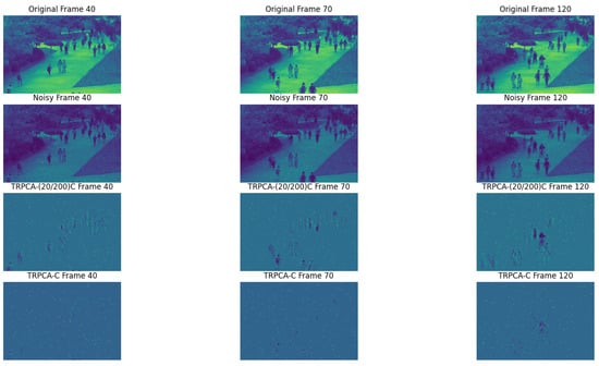 Comparison of denoised images with TRPAC-C (classic TRPCA) and TRPCA-(20/200)C( TRPCA) and frames = 40, 70, 120.