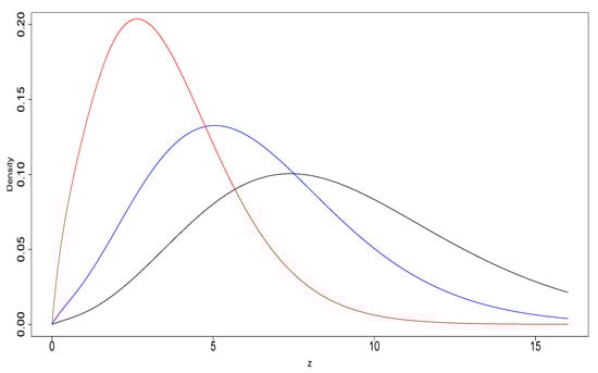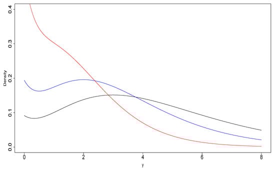 The L distribution has been used in various settings such as engineering, demography, reliability, and medicine, among others. Some researchers who have carried out these studies are Hussain [2], Ghitany et al. [3], Zakerzadeh and Dolati [4], Gómez-Déniz and Calderin-Ojeda [5], Krishna and Kumar [6], Bakouch et al. [7], Shanker et al. [8], Ghitany et al. [9], Al-Mutairi et al. [10], Oluyede and Yang [11], Shanker et al. [12], and Abouammoh et al. [13], among others. Similar to the L distribution, the AK distribution is generated based on a mixture of two components: an exponential distribution with a scale parameter and a gamma distribution with a shape parameter 3 and a scale parameter . The mixing ratios for these components are and , respectively. Shanker [14] introduced the AK distribution and applied it to real lifetime data sets from medical science and engineering. Thus, we say that a random variable Y has an AKdistribution with shape parameter if its pdf is given by