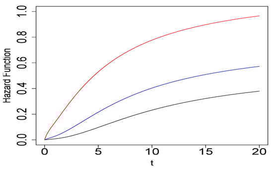 Hazard function of AKS distribution for selected values of : (black color), (blue color), and (red color).