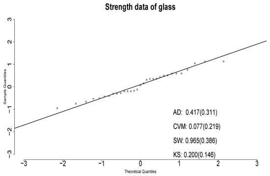 In Figure 5, the QRs for the AKS distribution are shown together with the p-values (in parentheses) of the AD, CVM, SW, and KS normality tests. It is seen that the AKS distribution verifies the assumption that the QRs come from the standard normal distribution, validating the fit of the AKS distribution to the strength of glass data.