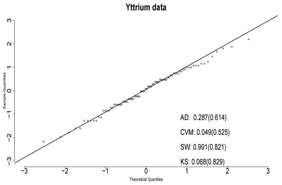 The residual quantiles of the AKS distribution are shown in Figure 6. Also, the p-values for the AD, CVM, SW, and KS normality tests are given to verify if the QRs come from a standard normal distribution. These indicate that the AKS distribution provides a good fit for the yttrium data.