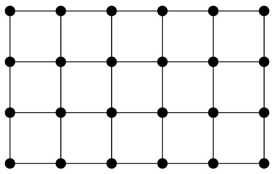 Let denote the two-dimensional grid graph that is a Cartesian product of and . The “grid graph” is a specific grid-like structure in graph theory, such as a two-dimensional grid graph with n rows and m columns, for example, the grid graph depicted in Figure 3. It is easy to obtain from the properties of the Cartesian product of the graph that and .