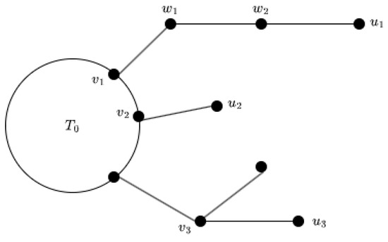 On the other hand, suppose on the contrary that in the case that . Let be a vertex such that the degree of is at least two in T. In other words, . Since , there must be a leaf such that .