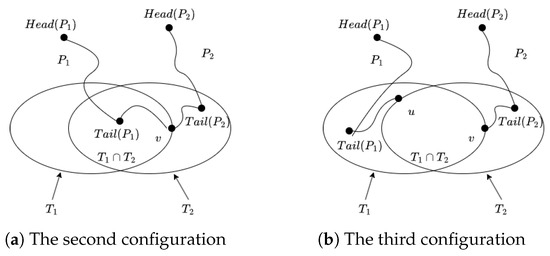 Suppose on the contrary that the subgraph induced by common edges has more than one component. Obviously, each component is a sub-path of , as well as . Let p and be two different components. For the reason that T is connected, there exists two distinct sub-paths connecting p and , respectively, in and . This implies a cycle in the tree T. □