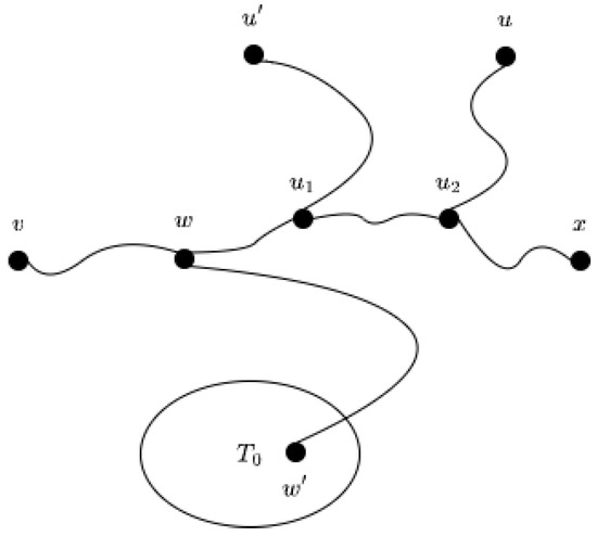 Now, let us consider the case that . Then, then the path between u and does go through w. Since is a tree u and w are connected in . To ensure the connectivity in , the path between u and w is the form , and must be in the tree . Then, the path between w and is in . This contradicts the fact that does not belong to . □
