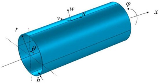 Consider a composite laminated circular cylindrical shell of length , thickness , and radius , as shown in Figure 1. The coordinate of the shell is taken along the meridional direction, the coordinate along the circumferential direction, and the coordinate along the thickness direction; the origin is at the mid-surface of the shell.