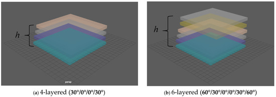 Figure 2 shows the layer alignment for 4-layered (30°/0°/0°/30°) and 6-layered (60°/30°/0°/0°/30°/60°) shells. Total thickness is represented by .
