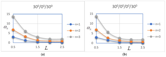 Angular frequency of 3- and 4-layered cylindrical shells with different layer alignments: (a) 30°/0°/30°, (b) 30°/0°/0°/30°.