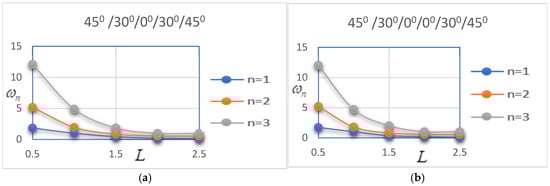 Angular frequency of 5- and 6-layered cylindrical shells with different layer alignments: (a) 45°/30°/0°/30°/45°, (b) 45°/30°/0°/0°/30°/45°.