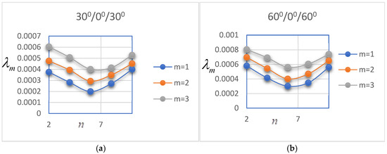 Frequency parameter with respect to circumferential node number of 3-layered cylindrical shells with different layer alignments: (a) 30°/0°/30°, (b) 60°/0°/60°.