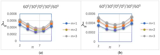 Frequency parameter with respect to circumferential node number of 5- and 6-layered cylindrical shells with different layer alignments: (a) 60°/30°/0°/30°/60°, (b) 60°/30°/0°/0°/30°/60°.