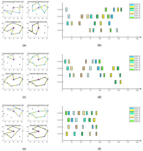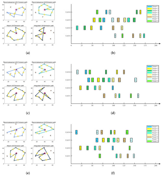 (a) The optimal task path with the objective of maximizing task profit. (b) The optimal cooperative assignment scheme with the objective of maximizing task profit. (c) The optimal task path with the objective of minimizing total distance. (d) The optimal task path with the objective of minimizing total distance. (e) The optimal task path with the objective of minimizing makespan. (f) The optimal task path with the objective of minimizing makespan. Notation: In (a,c,e), the orientation of the “yellow aircraft” indicates the direction of the corresponding path.