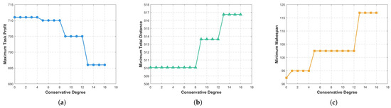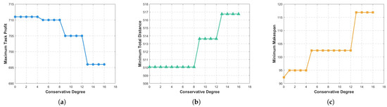 (a) Influence of conservative degree with the objective of maximizing task profit. (b) Influence of conservative degree with the objective of minimizing total distance. (c) Influence of conservative degree with the objective of minimizing makespan.