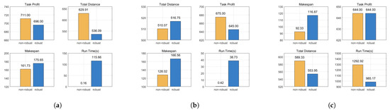 (a) Comparison of objective values between robust and non-robust solutions with the objective of maximizing task profit. (b) Comparison of objective values between robust and non-robust solutions with the objective of minimizing total distance. (c) Comparison of objective values between robust and non-robust solutions with the objective of minimizing makespan.