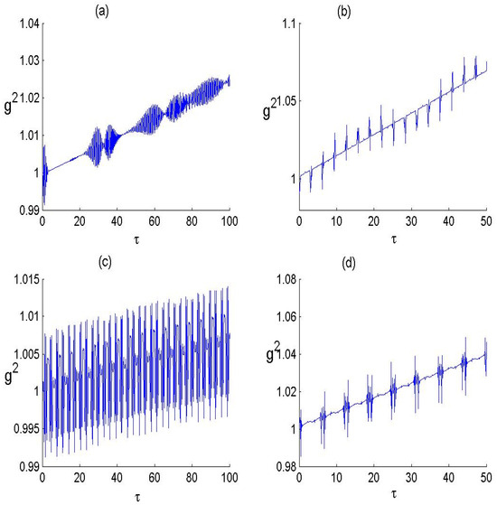 Figure 3 displays the quantum entanglement (QE), as measured by the von Neumann entropy, for the F-LA–P-BF state under varying field deformation and photon transition numbers. For q = 0, panels (a) and (b) depict the dynamics for single-photon (J = 1) and double-photon (J = 2) transitions, respectively. In the single-photon case, rapid oscillations are observed in the entanglement measure, with the amplitude fluctuating around a steady-state value before eventually stabilizing. In contrast, for the double-photon transition (J = 2), the entanglement exhibits quasi-periodic behavior. Unlike the single-photon case, the entanglement measure does not settle into a steady state. Panels (c) and (d) show the time-dependent behavior of entanglement for a non-zero field deformation parameter q for both single- and double-photon transitions, respectively. For J = 1, the function exhibits consistent periodic behavior with a constant amplitude of oscillations throughout the dynamics. In the double-photon transition case (J = 2), the QE dynamics also display periodicity, but the amplitude of oscillations varies over time, introducing an additional layer of complexity to the system’s behavior. Thus, the consideration of field deformation and double-photon transitions enhances the periodic nature of the entanglement measure during the evolution. These observations align with established studies in quantum optics, particularly the JCM, where single-photon transitions typically lead to periodic entanglement oscillations, while multi-photon transitions introduce interactions that increase quantum correlations. The quasi-periodic behavior in the J = 2 case suggests an enhanced interaction mechanism, as multi-photon absorption–emission processes can induce more complex quantum correlations. Studies on q-deformed oscillators and para-Bose fields have shown that deformation modifies energy levels and transition dynamics, which explains the stable periodic behavior in the J = 1 case and the varying oscillation amplitude in the J = 2 case. Additionally, entanglement dynamics in nonlinear quantum optics, such as Kerr-type media, exhibit similar periodic structures, indicating that para-Bose deformation effectively introduces an adjustable nonlinearity that influences quantum correlations. The ability to control entanglement oscillations through deformation and photon transition tuning presents promising applications in different tasks in quantum information and optics.
