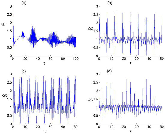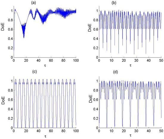 Dynamics of the as a measure of QE between F-LA and P-BF with and for the parameter values of P-BF deformed parameter and number of photons transitioned as (a) , (b) , (c) and (d) .