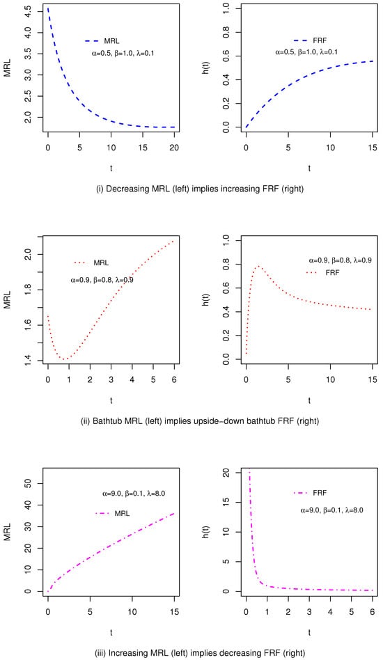 The MRL and FRF exhibit an inverse relationship, as they characterize different aspects of the same survival behavior. Mathematically, the MRL can be expressed using the FRF through the equation Furthermore, there exists another mathematical relationship between the MRL and FRF , defined as It is evident that The MRL and FRF uniquely determine a probability distribution, as discussed in [22,23]. Additionally, ref. [24] established the following relationships: an increasing MRL implies a decreasing FRF, while a decreasing MRL implies an increasing FRF. Moreover, [25] demonstrated that an upside-down bathtub-shaped MRL corresponds to a bathtub-shaped FRF. In addition, [26] highlighted that the MRL and FRF have a reciprocal relationship expressed as Consequently, a bathtub-shaped MRL implies an upside-down bathtub-shaped FRF. Figure 4 provides a graphical illustration of several relationships between the MRL and FRF for the proposed model at possible t.