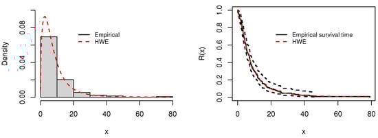 Plots of the histogram and fitted PDF (left), and empirical and fitted survival functions (right), for the first data.
