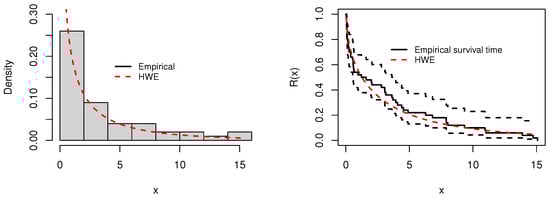 Plots of the histogram and fitted PDF (left), and empirical and fitted survival functions (right), for the second data.
