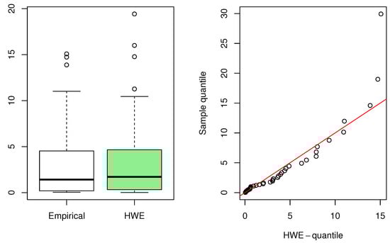 Box plot (left) and quantile–quantile plot (right) for the second data.