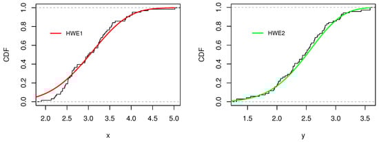 In this section, we illustrate the applicability of the HWE model in reliability analysis by applying it to two real-world datasets. This demonstration highlights the practical utility of the proposed estimation techniques. The reliability parameter is estimated using the MLE method. Additionally, confidence intervals for are constructed using non-parametric bootstrap BpCI and BtCI, based on bootstrap replications. To evaluate the fit of the HWE model to the datasets, the KS test is employed, providing a rigorous assessment of the model’s goodness-of-fit. The datasets, as described in [52], consist of two distinct types of measurements. The first dataset, denoted as X, corresponds to single fibers tested under tension at a gauge length of 10 mm, with a sample size of . The second dataset, denoted as Y, pertains to impregnated tows of 1000 fibers tested at a gauge length of 20 mm, with a sample size of .