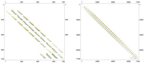 The sparsity pattern in Example 1 when , , and in (left) and , , and in (right). They show how a sparse solver can help in speeding up the solving process.