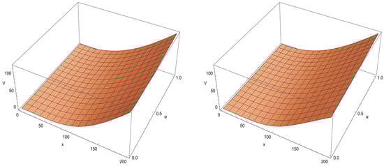 The numerical solution using PM in Example 1 when , , and in (left) and , , and in (right). They show the numerical solution is not only stable but also positive in two different cases of numerical discretization points.