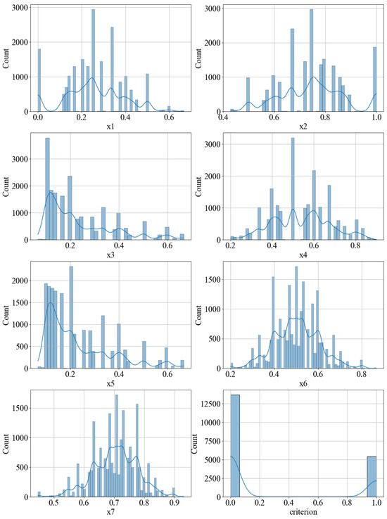To train a machine learning model that identifies the fulfillment of Condition (1) based on the parameters in (2), a total of 20,200 randomly generated graphs were used, modeling the structure of the information system. The mentioned parameters were calculated, and the fulfillment of Condition (1) was checked. It is clear that before training any machine learning model on a given dataset, it is necessary to thoroughly explore the dataset. First, potential anomalies need to be identified. For this purpose, we will construct the corresponding frequency histograms (Figure 1).