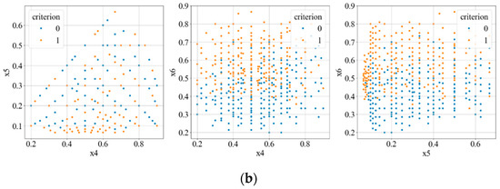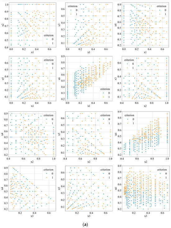 Now, let us investigate how the values of the parameters in the dataset are distributed when Condition (1) is satisfied and when it is not. To do this, we will create scatterplot slices, selecting all pairs of parameters from set (3). The first parameter in each pair will be plotted along the x-axis, and the second along the y-axis (see Figure 5). We will use blue to denote where Condition (1) is met, and red for where it is not met.