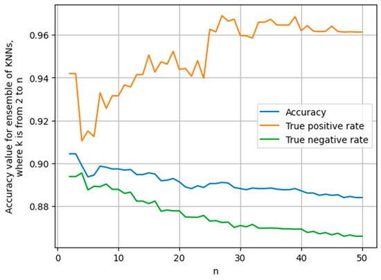 In Figure 6, we see two opposite tendencies. The first tendency is an increase in the accuracy of the described ensemble with an increase in parameter : when we increase this parameter, we may have higher accuracy. On the other hand, we see that an increase in parameter on average results in less accuracy in the identification of the fulfillment of Condition (1) (true positive rate) and less accuracy in the identification of the non-fulfillment of Condition (1) (true negative rate), but this decrease will be little with little deviation in . This may be explained by unbalanced data. This means that this tendency may potentially be corrected. In other words, the previously described ensemble will give higher accuracy than the models described earlier.