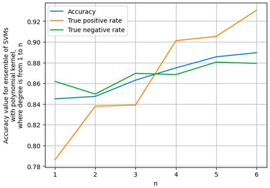 If we analogically build an ensemble of machine models which is based on the support vector machine method with the polynomial kernel and build an analogical picture (see Figure 7), we will see that this ensemble does not have the second tendency of the ensemble described previously. This may mean that the ensemble based only on SVMs with different polynomial degrees may better identify Condition (1) using the parameters in (3).
