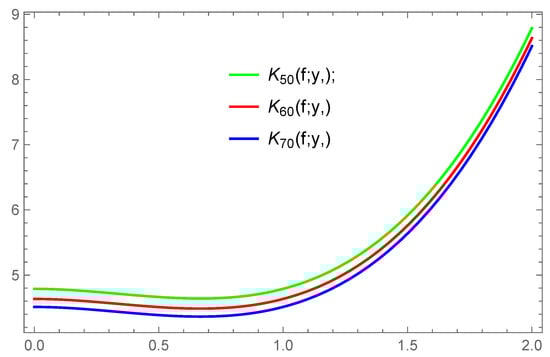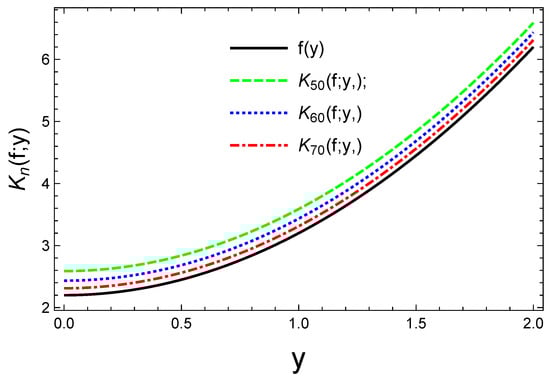 In this section, we analyze the convergence properties of the operators defined in (5) for different values of n, specifically , , and . Figure 1 visualizes the convergence behavior, demonstrating the impact of increasing n on the operator’s performance, while Figure 2 illustrates the approximation error trends. The numerical errors, computed using the formula for the function , are presented in Table 1. These errors provide a quantitative measure of the approximation accuracy for different values of n and highlight the rate of convergence as n increases. From Figure 1, we observe that larger values of n improve the operators’ convergence to , while Figure 2 shows a consistent reduction in the approximation error, demonstrating the effectiveness of the operators for higher values of n. Table 1 further confirms that the error decreases significantly as n increases, validating the theoretical convergence properties. This numerical analysis not only supports the theoretical findings but also offers a practical understanding of the operator’s behavior. By evaluating the errors across different y values, we gain insights into the robustness and efficiency of the operators in approximating , which is essential for applications requiring high accuracy.