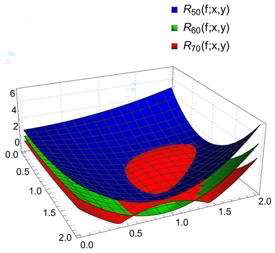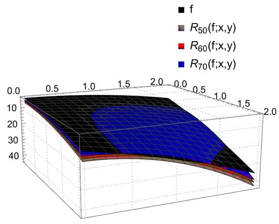 We present graphical and numerical analyses of the bivariate operators defined in (13) to demonstrate their convergence. Using the test function , the convergence behavior is illustrated in Figure 3. To examine the error approximation, we employ the formula , analyzing the error for different values of n and m, specifically and 70. The corresponding error approximations are graphically represented in Figure 4 and numerically tabulated in Table 2. Collectively, the figures and the table provide insights into the behavior and accuracy of the operator as n and m increase, confirming its convergence to the target function .