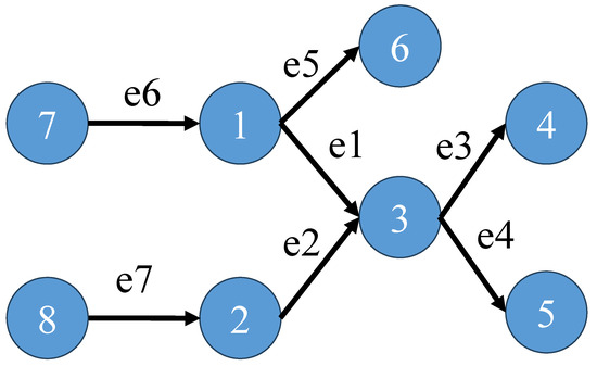 We map this relationship in a river network into a directed network and use Figure 1 for illustration. Regard the flow of river as a kind of edge importance; then, for the directed network, the importance of each edge will satisfy the following relation: (i) the importance of edge () is positively correlated with the importance of the predecessor edges of node u (the importance of is positively correlated with ); () the importance of edge () is positively correlated with the importance of the successor edges of node v (the importance of is positively correlated with ); () the importance of edge () is negatively correlated with the importance of the successor edges of node u (the importance of is negatively correlated with the importance of ); () the importance of edge () is negatively correlated with the importance of the predecessor edges of node v (the importance of is negatively correlated with ).